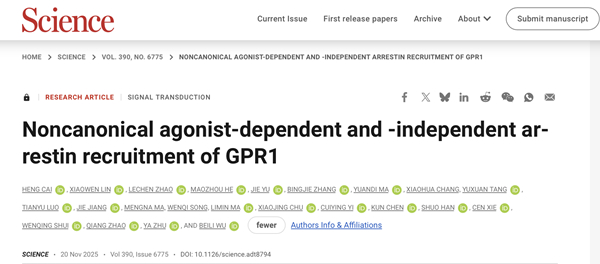 北京时间11月21日凌晨,国科大杭州高等研究院(以下简称“杭高院”)药物科学与技术学院(以下简称“药学院”)/中国科学院上海药物研究所(以下简称“上海药物所”)吴蓓丽课题组联合临港实验室朱亚课题组、上海药物所赵强课题组、上海科技大学水雯菁课题组和上海药物所谢岑课题组最新成果——“Noncanonical agonist-dependent and -independent arrestin recruitment of GPR1”在国际顶级学术期刊Science正式发表。