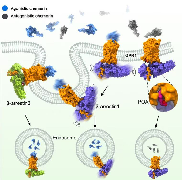 包括GPR1在内的众多GPCR不仅可被激动剂激活后内吞,还可在非激活状态下内吞,这是GPR1清除不同活性趋化素(激活型趋化素和非激活型趋化素)以维持其功能动态平衡的关键机制,但相关分子机理不明。研究人员通过结构和功能研究发现,不与趋化素结合时,GPR1的构象处于非激活状态,这使β-arrestin 1通过一种全新的模式与其结合。质谱分析的结果显示,非激活的GPR1的C端区域具有较高的基底磷酸化水平,促进了受体对阻遏蛋白的招募及其内吞。