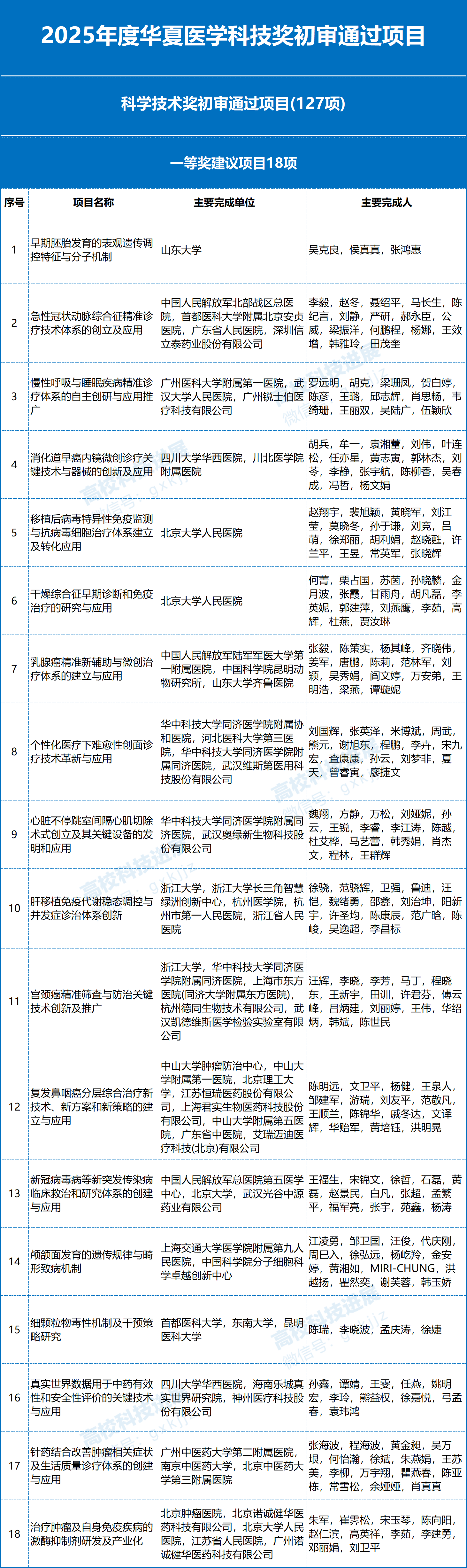 2025年度华夏医学科技奖初审通过项目177项,其中科学技术奖一等奖建议项目18项,科学技术奖其他初审通过项目109项;卫生事业管理奖初审通过8项;医学科普奖初审通过项目1项,国际合作促进奖初审通过候选人1人,青年医学科技奖初审通过候选人40人。