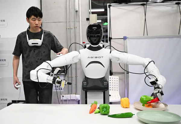 广东省具身智能机器人创新中心,工作人员操纵机器人同步动作。 新华社记者邓华 摄 在更为精密的眼科手术领域,中国科学院自动化研究所研究员边桂彬团队研发的智能显微手术机器人,能够稳定地进行视网膜下血管注射等精细操作。