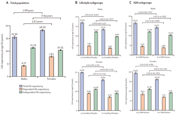 图 不同健康生活方式和社会决定因素对65岁男性和女性预期寿命的影响