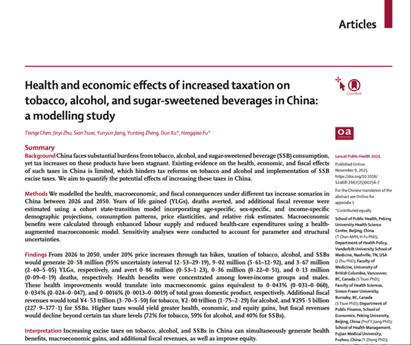 近日,北京大学公共卫生学院傅虹桥博士与中国社会科学院人口与劳动经济研究所许多博士的联合团队在《Lancet Public Health》期刊在线发表了题为Health and economic effects of increased taxation on tobacco, alcohol, and sugar-sweetened beverages in China: a modelling study的研究论文,首次全面评估了在中国提升烟草、酒精、含糖饮料税率的健康、经济与财政效应,为中国和全球的健康税改革提供了政策依据。
