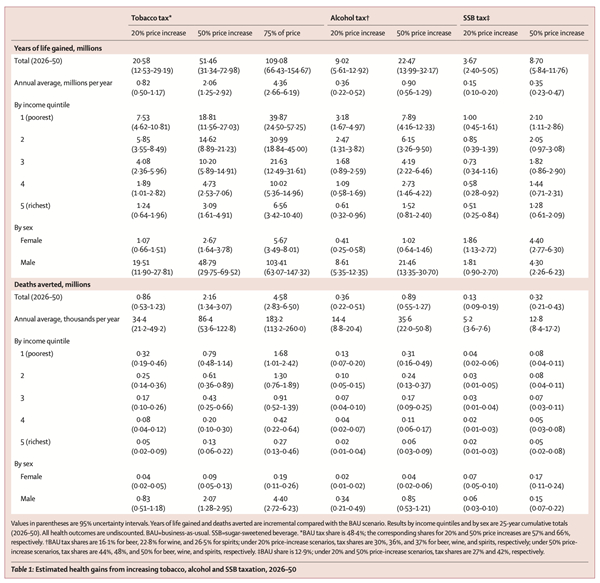 研究基于队列状态转移模型和健康增强宏观经济模型,模拟了2026-2050年间不同增税情景下的潜在收益。研究结果显示,若通过增加消费税使商品零售价格上涨20%,烟草、酒精和含糖饮料税将分别带来2058万、902万和367万生命年增益,并分别避免86万、36万和13万例过早死亡,大约相当于烟酒糖相关疾病负担6%。健康收益主要集中在低收入群体和男性群体。这些健康改善可转化为相应的宏观经济收益,分别相当于国内生产总值的0.043%、0.034%和0.0016%。此外,额外税收收入分别可达4.5万亿元、2.0万亿元和2955亿元。每年额外税收收入相当于2023年中国政府卫生财政投入的11%左右。