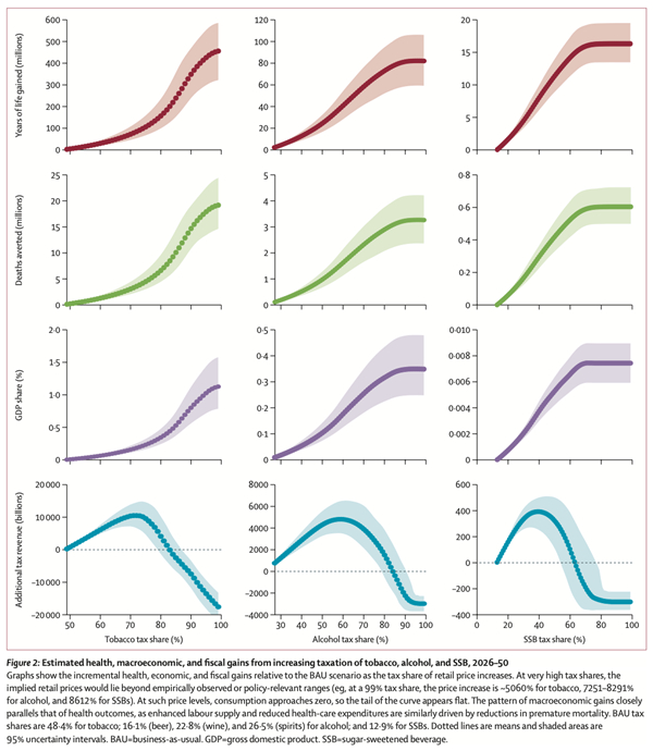 研究进一步发现,在更高的税负水平下,健康、经济及公平性效应将进一步提升,但当税收占比超过特定阈值后,财政收入将出现下降。研究结果为中国推进基于证据的健康税改革提供了量化依据,也为全球低中收入国家探索以税促健、以税筹资的可持续路径提供了经验参考。