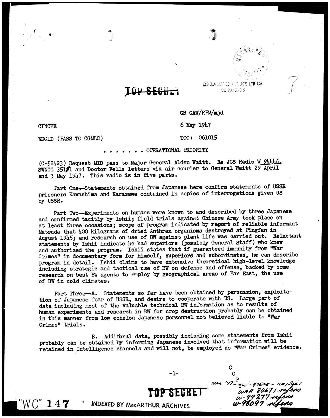 1947年 5月 6日,美国远东司令部给美国陆军部情报总局发送的军事急电 C-52423之二(美国国家档案馆藏) 《731:医学的沦陷》一书插图