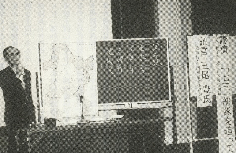 1995年 11月 26日,三尾丰在七三一部队展日本全国巡回展出会上发言(《认罪之旅:七三一部队与三尾丰的记录》)
