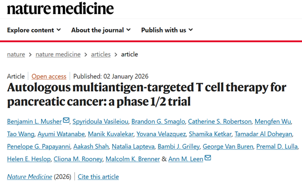 [1]Musher, B.L., Vasileiou, S., Smaglo, B.G. et al. Autologous multiantigen-targeted T cell therapy for pancreatic cancer: a phase 1/2 trial. Nat Med (2026). https://doi.org/10.1038/s41591-025-04043-5