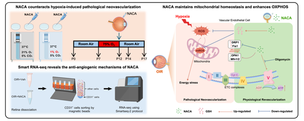 该研究综合运用Polar-SIM超分辨显微成像、smart RNA-seq及Seahorse细胞能量代谢分析等关键技术,首次在细胞与动物模型上系统证实,NACA可有效抑制缺氧诱导的血管内皮细胞异常活化及病理性新生血管形成。从机制上看,NACA能逆转线粒体超微结构损伤、维持线粒体动力学并增强线粒体氧化磷酸化水平,重塑血管内皮细胞能量代谢,进而发挥治疗作用。