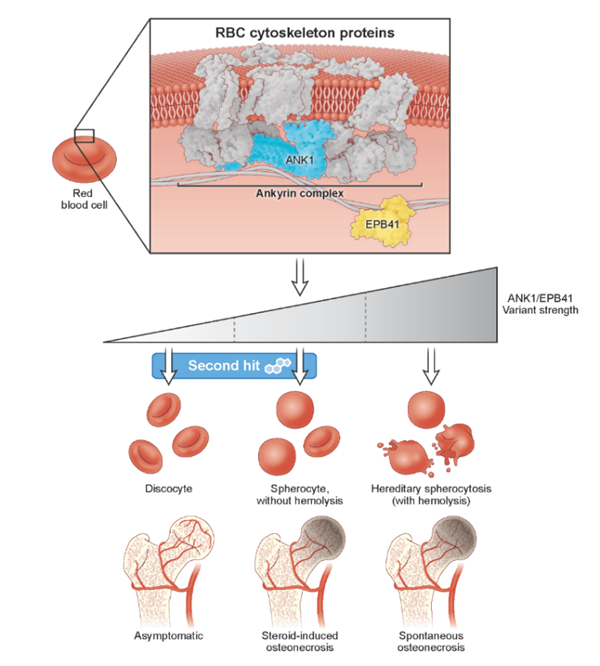 研究团队利用多种测序和分析方法,首次发现与血影蛋白带结合的编码锚蛋白、红细胞膜带蛋白4.1的基因ANK1、EPB41罕见变异与激素性股骨头坏死密切关联,且变异与特定疾病无关,是激素导致股骨头坏死的普适性罕见有害变异。该类罕见有害变异符合孟德尔遗传规律,且变异引起红细胞膜功能缺陷。膜脆性增加导致红细胞可变形性下降,引起局部组织微循环缺氧损伤的不利条件,在无外在诱因下能够健康代偿,然而在激素暴露的“二次打击”下易加重微循环损伤导致微循环障碍。