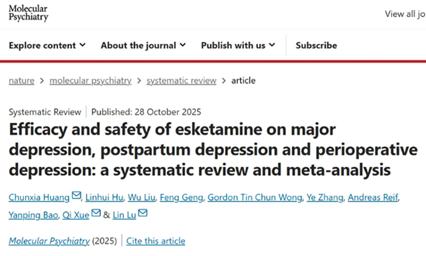 近日,山东第一医科大学脑科学与类脑研究院陆林院士及黄春霞博士后、安徽医科大学第二附属医院薛琦助理研究员研究团队,在Molecular Psychiatry杂志在线发表题为“Efficacy and safety of esketamine on major depression, postpartum depression and perioperative depression: a systematic review and meta-analysis”的最新研究成果,全面评估了艾司氯胺酮在治疗MDD/TRD、预防产后抑郁(PPD)和术后抑郁症方面的效果与安全性,包括不同给药方式之间及给药剂量内部的比较。
