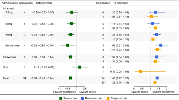 图1. 艾司氯胺酮治疗重症抑郁症、难治性抑郁症疗效森林图