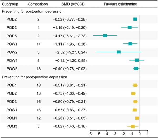 图2. 艾司氯胺酮预防产后、术后抑郁疗效森林图