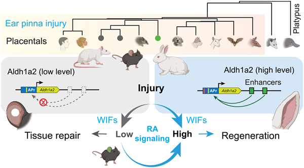 2025年6月,北京生命科学研究所研究员王伟实验室与北京华大生命科学研究院研究员邓子卿、西北农林科技大学教授罗军等团队合作,在《科学》发表研究论文,揭示了视黄酸信号通路的活性强弱是决定哺乳动物耳廓再生与否的“分子开关”。