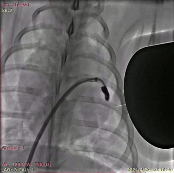 DSA(数字减影血管造影)拍摄的巴马猪体内磁流体左心耳封堵实验过程。深圳先进院供图