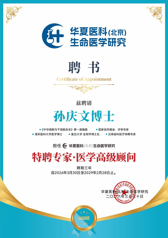 近日,华夏医科(北京)生命医学研究正式发布聘任公告,聘请生命医学领域知名专家孙庆文博士担任特聘专家·医学高级顾问,聘期三年。此次聘任,是华夏医科(北京)生命医学研究汇聚优质学术力量、强化科研竞争力的重要战略布局,标志着机构在生命医学领域的人才建设与产学研融合迈入新发展阶段,为推动我国生命健康产业高质量发展注入积极动能。