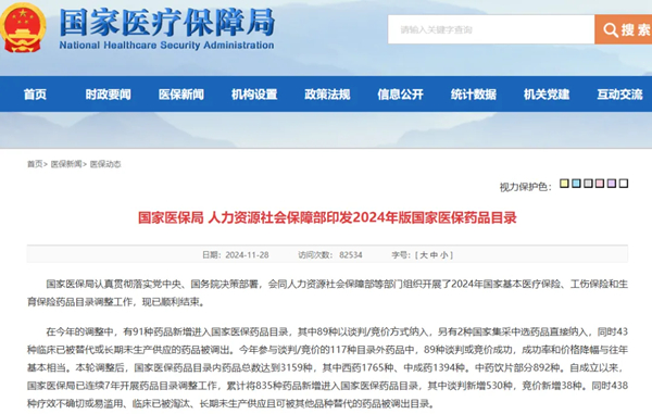 据国家医保局官网,2025年1月1日起,新版国家医保药品目录将正式实施,共新增91种药品,其中肿瘤用药26种(含4种罕见病)、糖尿病等慢性病用药15种(含2种罕见病)、罕见病用药13种、抗感染用药7种、中成药11种、精神病用药4种,以及其他领域用药21种。