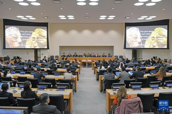 随后,由“《文明宣言》——人类命运共同体的美好画卷I”“太阳之光——古蜀文明与世界”“文明互鉴·世界愿景”图形印展三部分组成的“文明交流互鉴”系列展览也在联合国总部开幕。