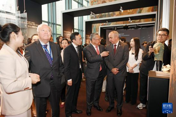 6月9日,在位于纽约的联合国总部,嘉宾参观“太阳之光——古蜀文明与世界”展览。新华社记者 李睿 摄